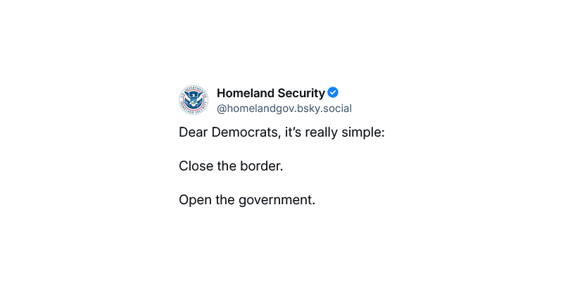 Another move in the last week by the Trump administration has been for various government agencies to join Bluesky. That hardly seems like “essential” work during a government shutdown. It also hasn’t shown them to be really competent. Yesterday the DHS posted this: