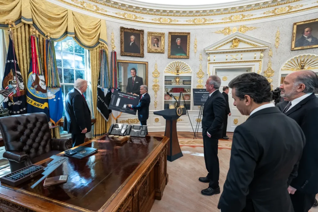 In this photo you can see Dr. Mehmet Oz explaining one of the posters that would be presented at an Oval Office press briefing: