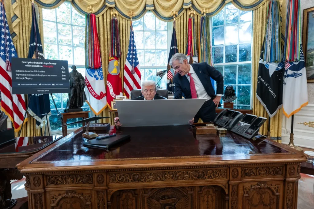 Photos released by the White House show him doing this again this week, though with a less serious topic to mislead on, the price of weight loss drugs.