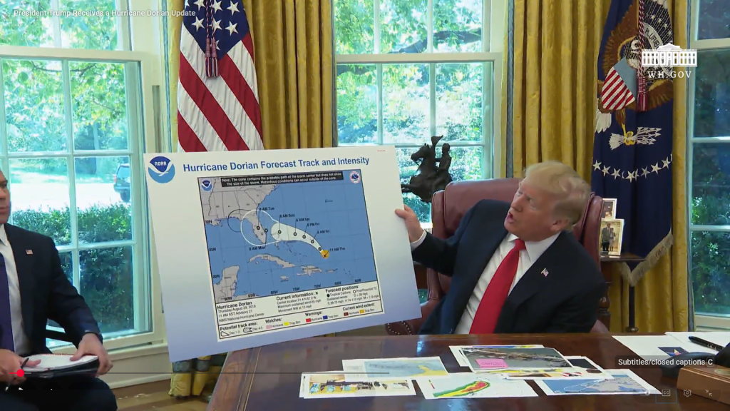During Donald Trump’s first term, there was Sharpiegate, which involved in part him altering a poster showing the expected track of a hurricane to include Alabama in the path of the storm. After he had falsely claimed it was at risk from the hurricane several days before. Here was the original poster being shown to him in the Oval Office: